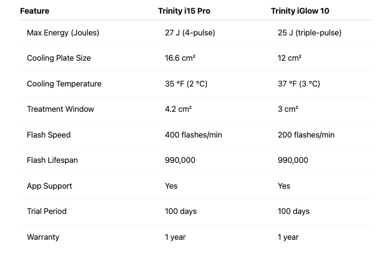 Trinity iGlow 10: Maxes out at 25 joules per flash using triple-pulse technology. This spreads energy over three bursts for skin gentleness.