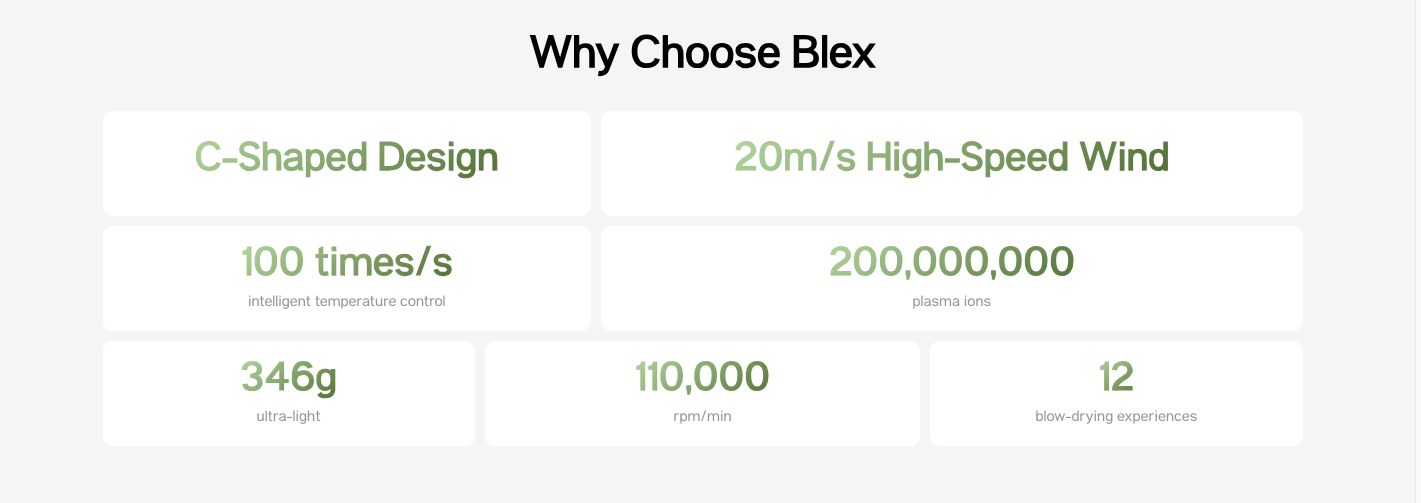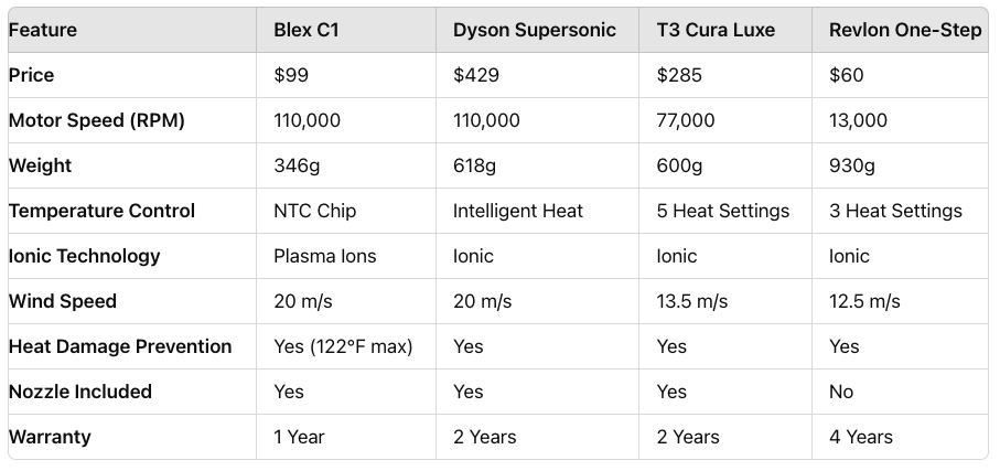 To help you make an informed decision, we’ve put together a comparison chart of the Blex C1 and other popular high-speed hairdryers on the market: